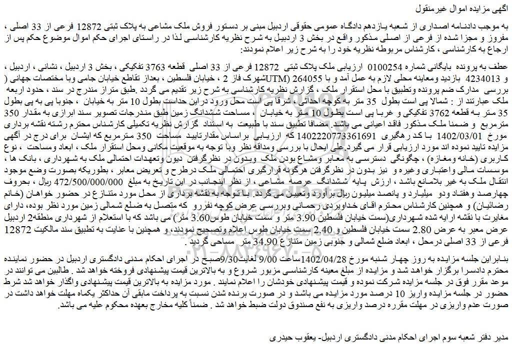 به موجب دادنامه اصداری از شعبه یازدهم دادگاه عمومی حقوقی اردبیل مبنی بر دستور فروش ملک مشاعی به پلاک ثبتی 12872 فرعی از 33 اصلی ، مفروز و مجزا شده از فرعی از اصلی مذکور واقع در بخش 3 اردبیل به شرح نظریه کارشناسی لذا در راستای اجرای حکم اموال موضوع حکم پس از ارجاع به کارشناسی ، کارشناس مربوطه نظریه خود را به شرح زیر اعلام نمودند: