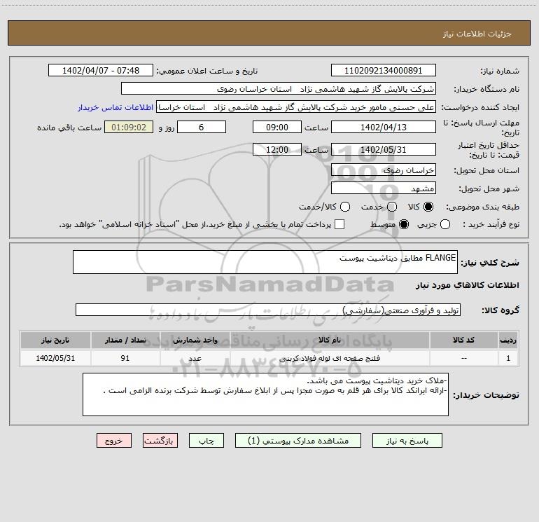 شرح کلی نیاز: FLANGE مطابق دیتاشیت پیوست