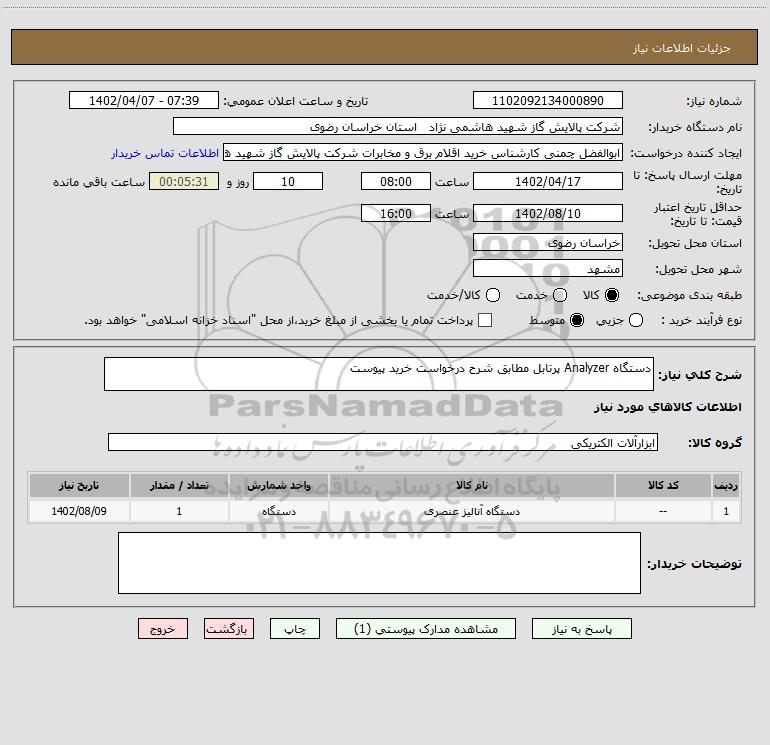 نام دستگاه خریدار:شرکت پالایش گاز شهید هاشمی نژاد استان خراسان رضوی