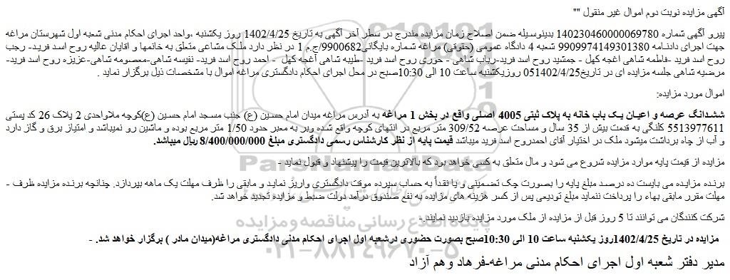 پیرو آگهی شماره 140230460000069780 بدینوسیله ضمن اصلاح زمان مزایده مندرج در سطر آخر آگهی به تاریخ 1402/4/25 روز یکشنبه ،واحد اجرای احکام مدنی شعبه اول شهرستان مراغه جهت اجرای دادنامه 9909974149301380 شعبه 4 دادگاه عمومی (حقوقی) مراغه شماره بایگانی9900682/ج.م 1 در نظر دارد ملک مشاعی متعلق به خانمها و اقایان عالیه روح اسد فرید- رجب روح اسد فرید -فاطمه شاهی اغجه کهل - جمشید روح اسد فرید-رباب شاهی - حوری روح اسد فرید -طیبه شاهی آغجه کهل - احمد روح اسد فرید- نفیسه شاهی-معصومه شاهی-عزیزه روح اسد فرید-مرضیه شاهی جلسه مزایده ای در تاریخ051402/4/25 روزیکشنبه ساعت 10 الی 10:30صبح در محل اجرای احکام دادگستری مراغه اموال با مشخصات ذیل برگزار نماید .