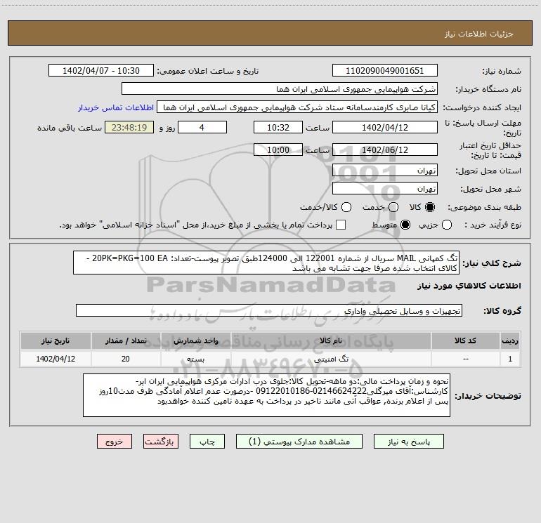 شرح کلی نیاز: تگ کمپانی MAIL سریال از شماره 122001 الی 124000طبق تصویر پیوست-تعداد: 20PK=PKG=100 EA - کالای انتخاب شده صرفا جهت تشابه می باشد