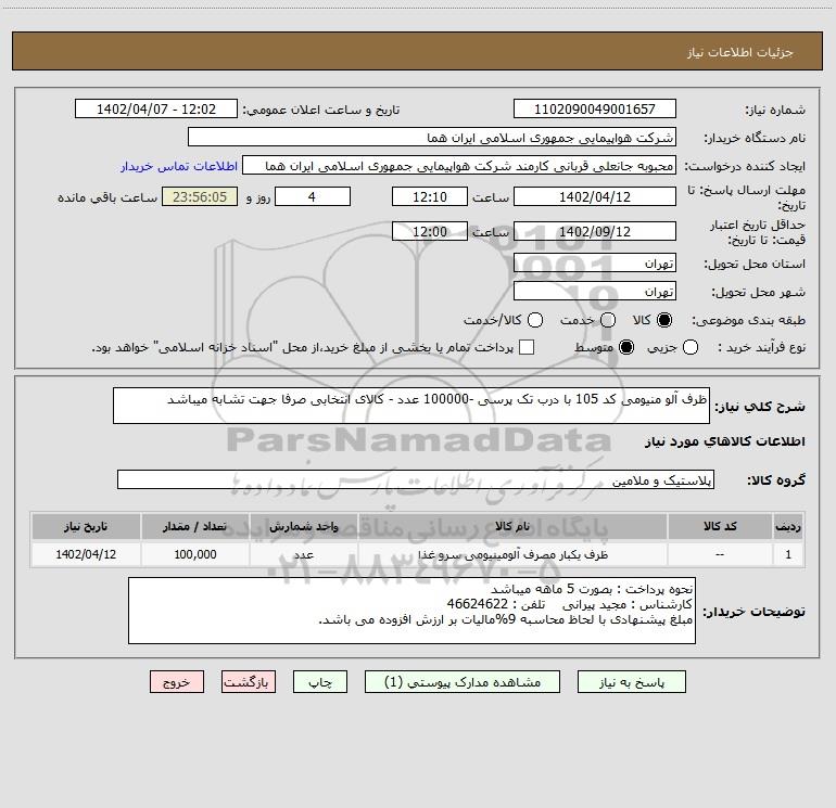 شرح کلی نیاز: ظرف آلو منیومی کد 105 با درب تک پرسی -100000 عدد - کالای انتخابی صرفا جهت تشابه میباشد