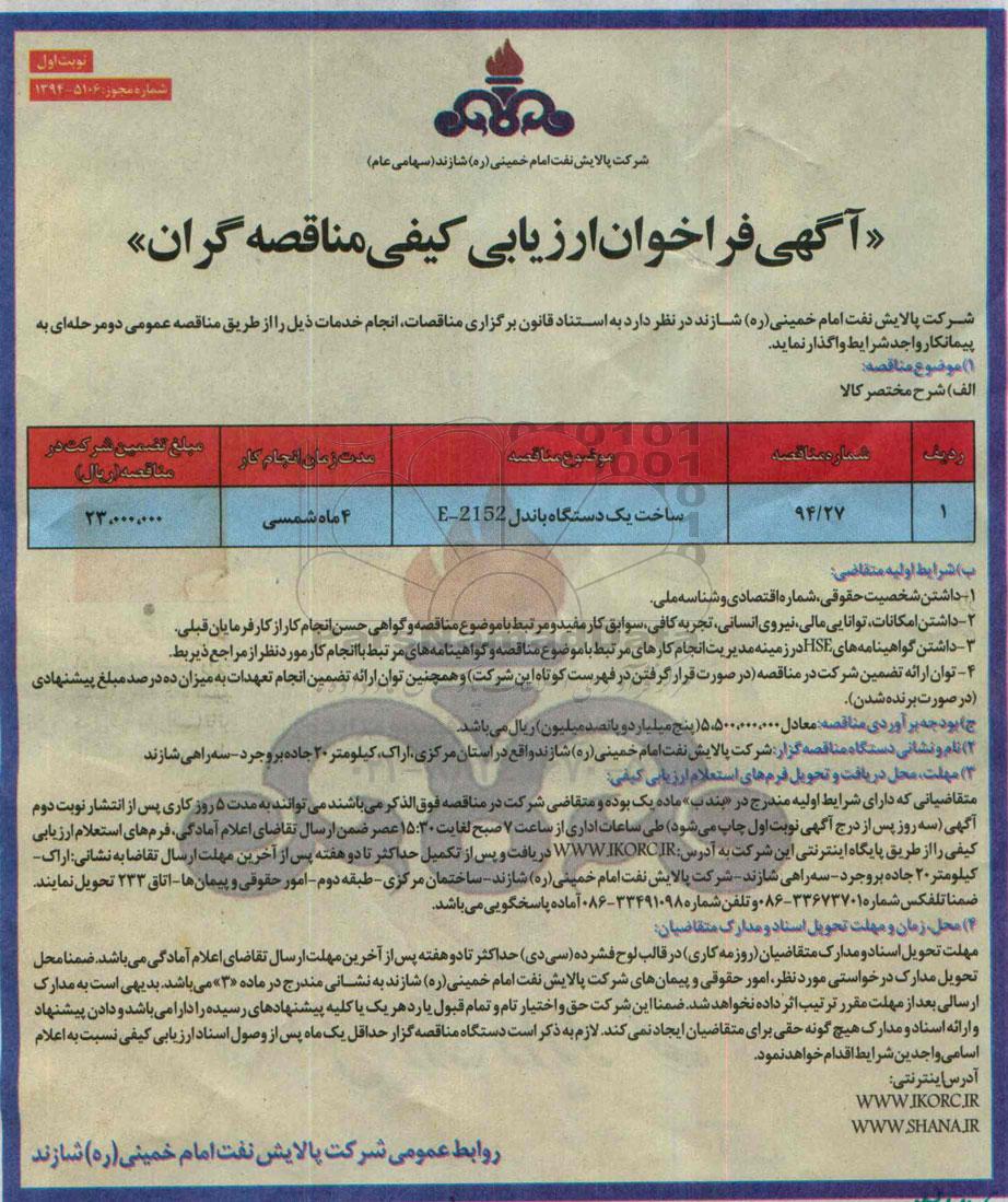 فراخوان ساخت یک دستگاه باندل E-2152 , آگهی فراخوان ارزیابی کیفی مناقصه گران , فراخوان ساخت یک دستگاه باندل E-2152