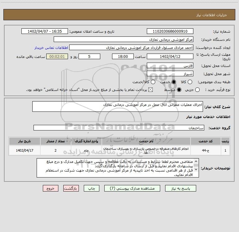 شرح کلی نیاز: اجرای عملیات عمرانی اتاق عمل در مرکز آموزشی درمانی نمازی