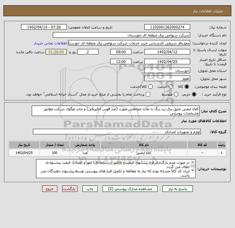 شرح کلی نیاز: کلاه ایمنی عایق برق زرد رنگ با نقاب حفاظتی صورت (ضد قوس الکتریکی) و چاپ لوگوی شرکت مطابق مشخصات پیوستی