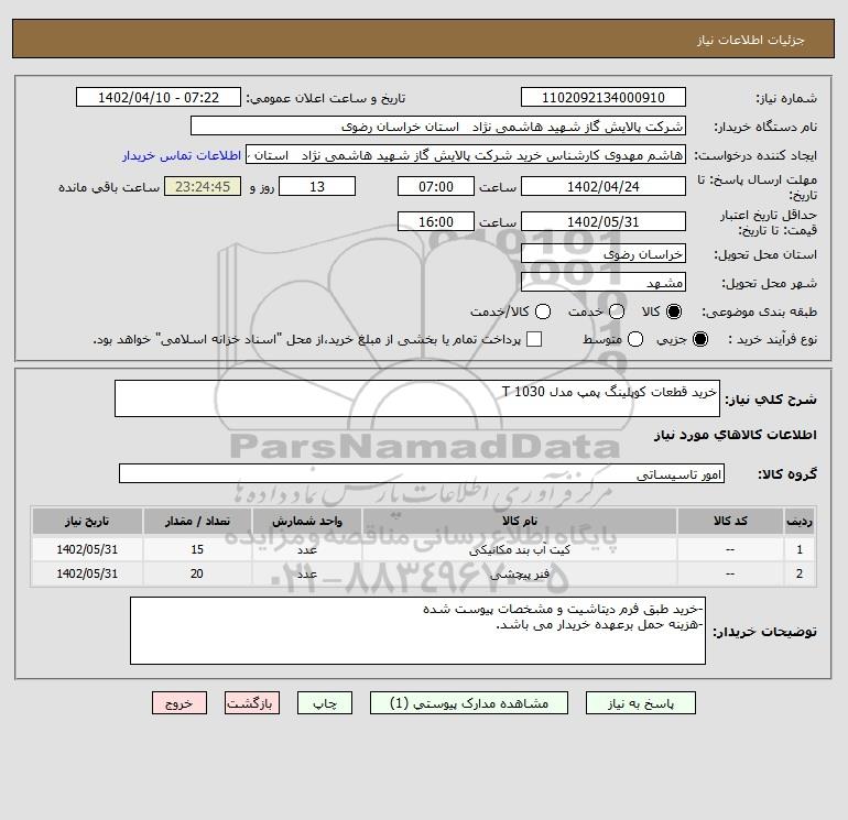 شرح کلی نیاز: خرید قطعات کوپلینگ پمپ مدل 1030 T