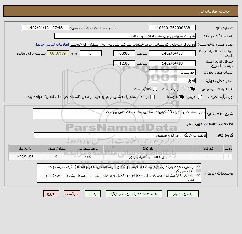 شرح کلی نیاز: تابلو حفاظت و کنترل 33 کیلوولت مطابق مشخصات فنی پیوست