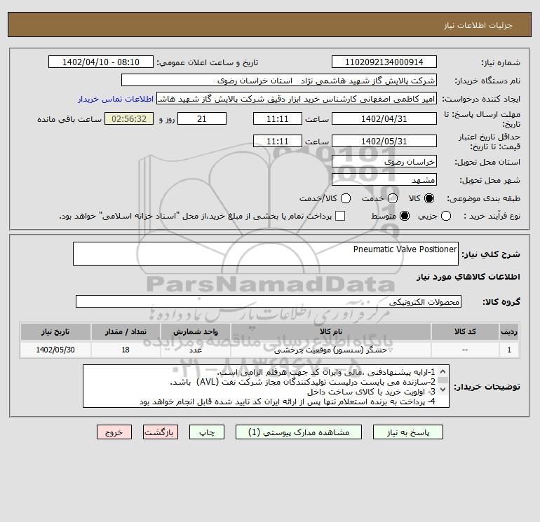 شرح کلی نیاز: Pneumatic Valve Positioner