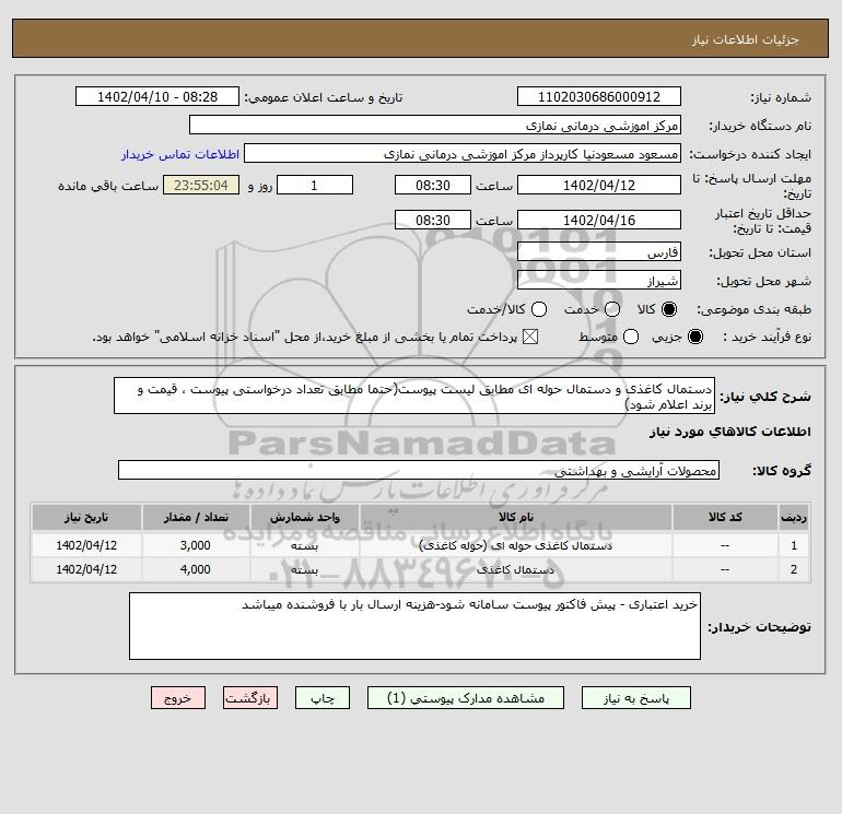 شرح کلی نیاز: دستمال کاغذی و دستمال حوله ای مطابق لیست پیوست(حتما مطابق تعداد درخواستی پیوست ، قیمت و برند اعلام شود)