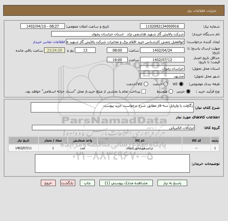 شرح کلی نیاز: رگاولت یا واریابل سه فاز مطابق شرح درخواست خرید پیوست