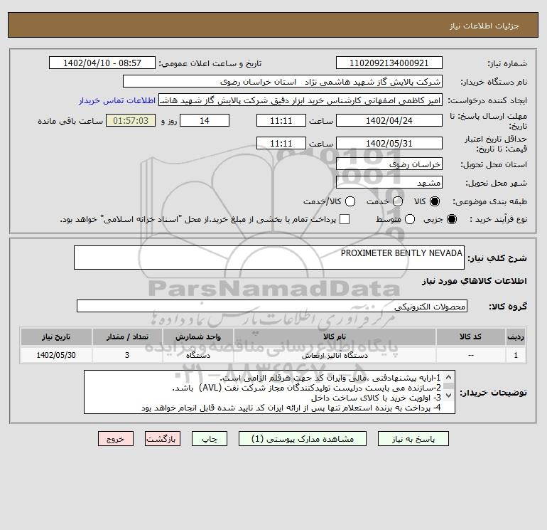 شرح کلی نیاز: PROXIMETER BENTLY NEVADA