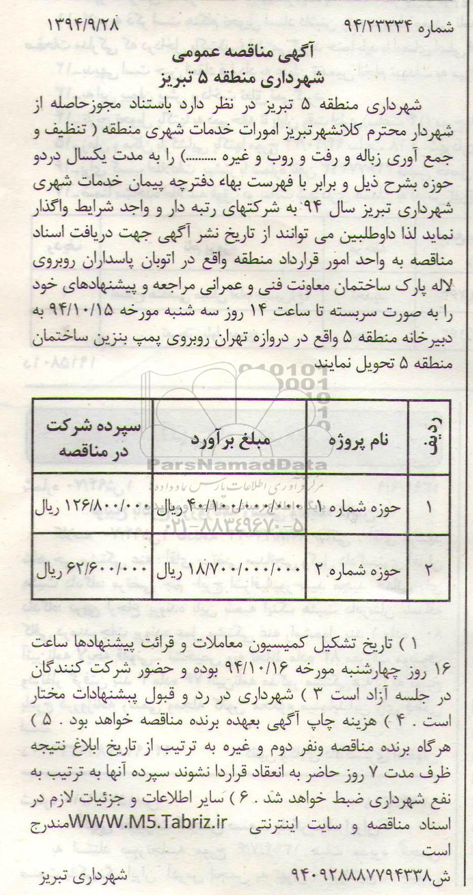 شهرداری منطقه 5 تبریز در نظر دارد به استناد مجوز حاصله از شهردار محترم کلانشهر تبریز امورات خدمات شهری منطقه ( تنظیف و جمع آوری زباله و رفت و روب و غیره ) را به مدت یکسال در دو حوزه بشرح ذیل و برابر با فهرست بها دفترچه پیمان خدمات شهری شهرداری تبریز سال 94 به شرکت های رتبه دار و واجد شرایط واگذار نماید لذا داوطلبین می توانند از تاریخ نشر آگهی جهت دریافت اسناد مناقصه به واحد امور قرارداد منطقه واقع در اتوبان پاسداران روبروی لاله پارک ساختمان معاونت فنی و عمرانی مراجعه و پیشنهادهای خود را به صورت سربسته تا ساعت 14 روز سه شنبه مورخ 94.10.15 به دبیرخانه منطقه 5 واقع در دروازه تهران روبروی پمپ بنزین ساختمان منطقه 5 تحویل نمایند.