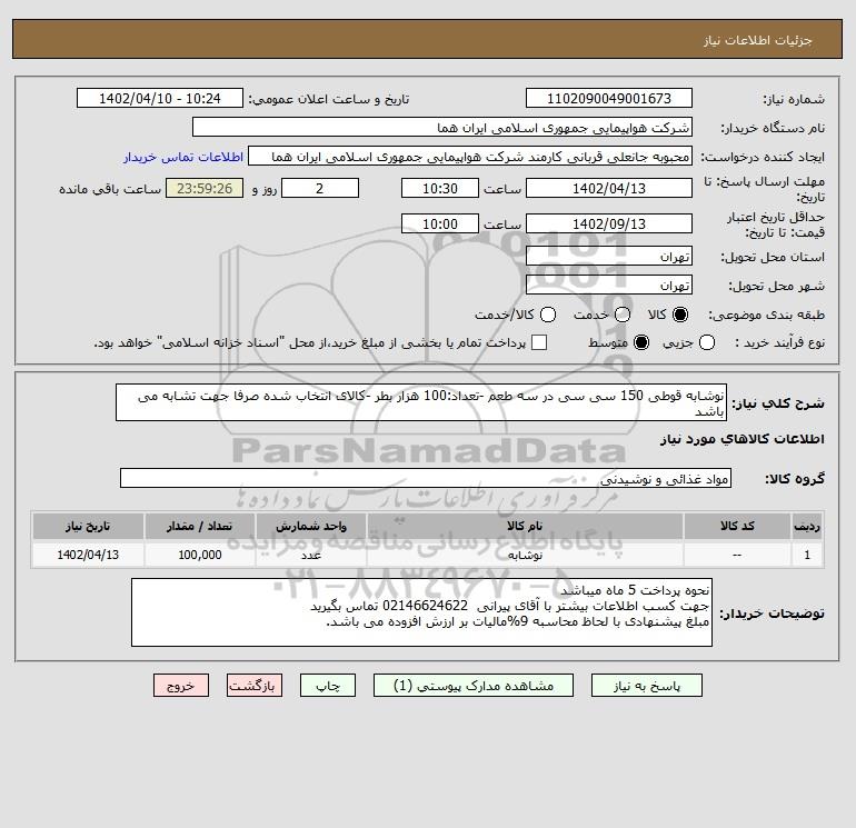 شرح کلی نیاز: نوشابه قوطی 150 سی سی در سه طعم -تعداد:100 هزار بطر -کالای انتخاب شده صرفا جهت تشابه می باشد