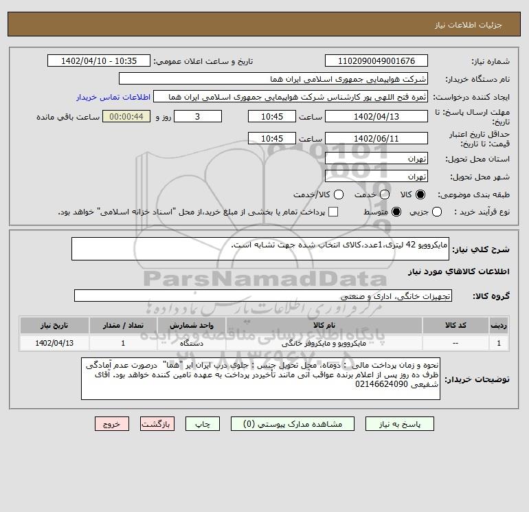 شرح کلی نیاز: مایکروویو 42 لیتری،1عدد،کالای انتخاب شده جهت تشابه است.