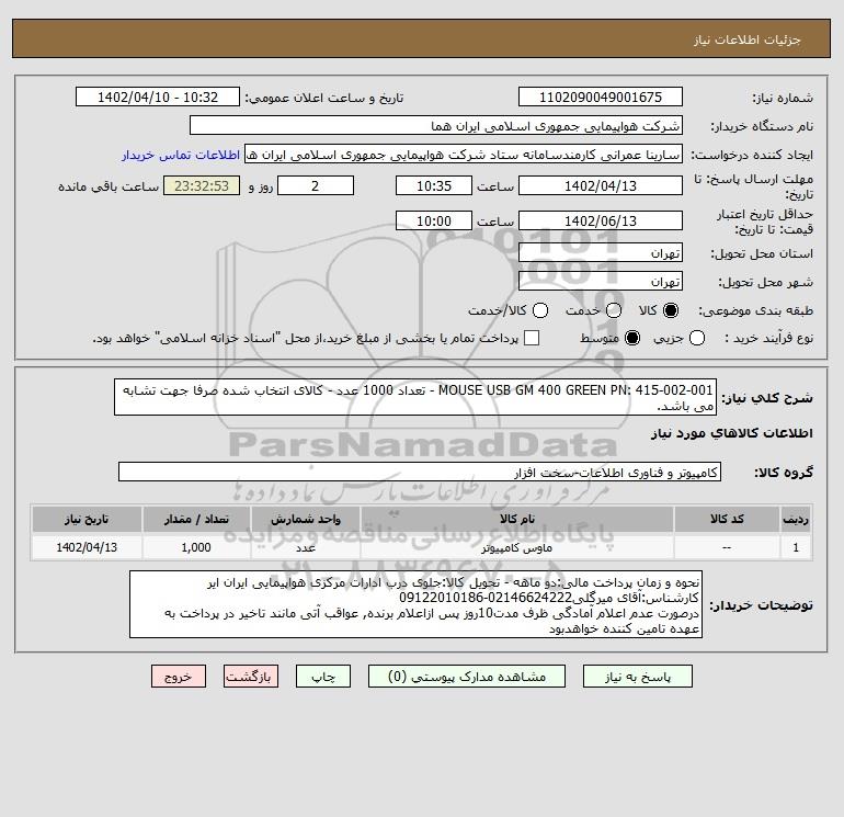 شرح کلی نیاز: MOUSE USB GM 400 GREEN PN: 415-002-001 - تعداد 1000 عدد - کالای انتخاب شده صرفا جهت تشابه می باشد.