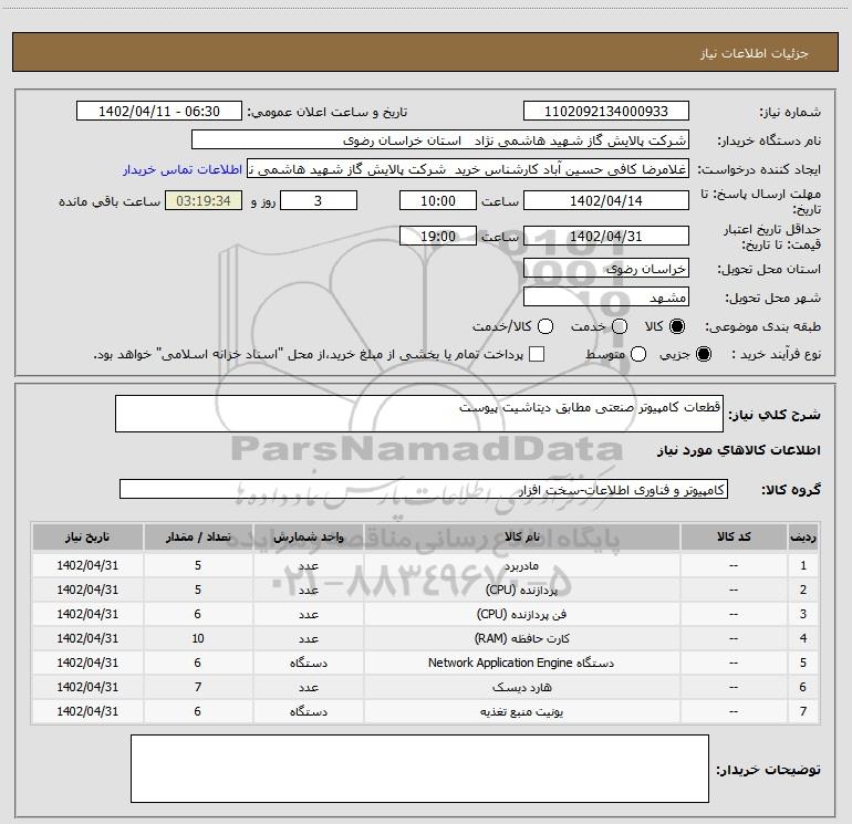 نام دستگاه خریدار:شرکت پالایش گاز شهید هاشمی نژاد استان خراسان رضوی