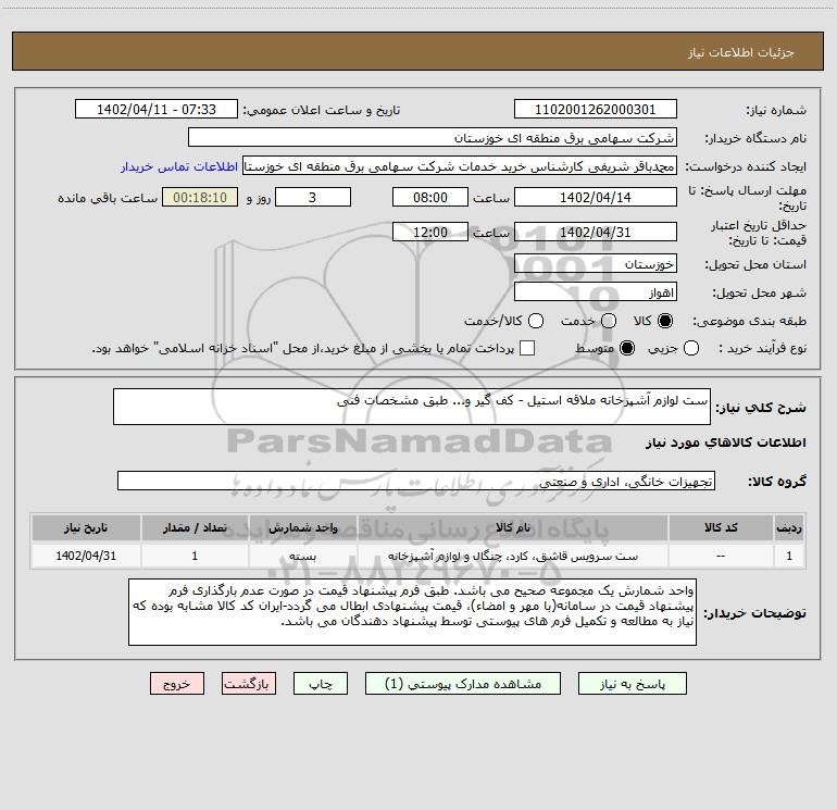 شرح کلی نیاز: ست لوازم آشپزخانه ملاقه استیل - کف گیر و... طبق مشخصات فنی