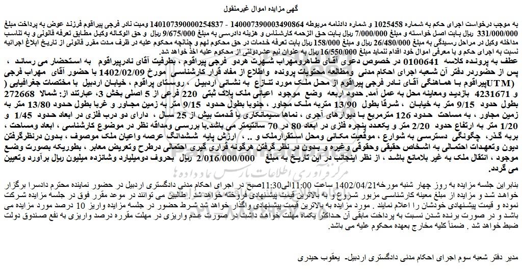 بنابراین جلسه مزایده به روز چهار شنبه مورخه1402/04/21 ساعت 11:00الی11:30صبح در اجرای احکام مدنی دادگستری اردبیل در حضور نماینده محترم دادسرا برگزار خواهد شد و مزایده از مبلغ معینه کارشناسی مزبور شروع و به بالاترین قیمت پیشنهادی فروخته خواهد شد . طالبین می توانند در موعد مقرر فوق در جلسه مزایده شرکت نموده و قیمت پیشنهادی خودشان را اعلام نمایند . مورد مزایده به بالاترین قیمت پیشنهادی واگذار خواهد شد شرط حضور در جلسه مزایده واریز 10 درصد مورد مزایده می باشد و در صورت برنده شدن نسبت به پرداخت مابقی آن حداکثر یکماه مهلت خواهد داشت در صورت عدم واریزی در مهلت مقرره درصد واریزی به نفع صندوق دولت ضبط خواهد شد . ضمناً کلیه مخارج بعهده محکوم علیه می باشد.