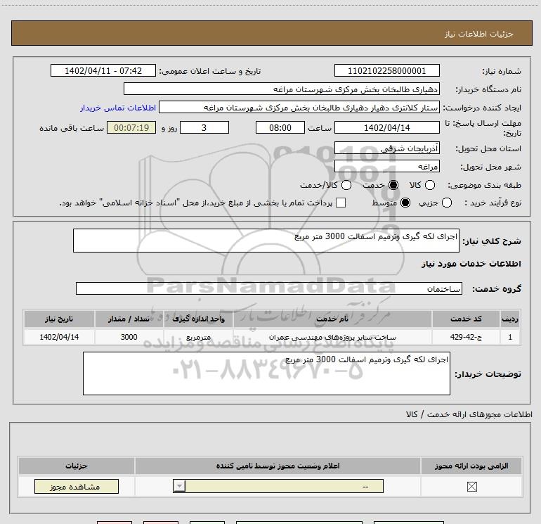 شرح کلی نیاز: اجرای لکه گیری وترمیم اسفالت 3000 متر مربع