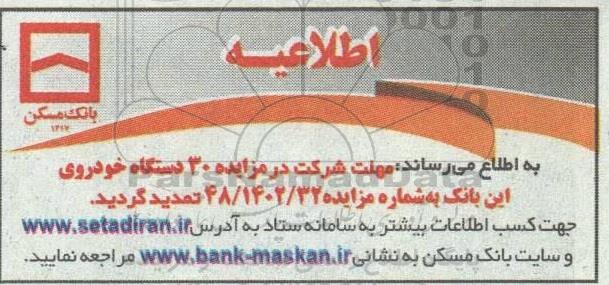 به اطلاع می رساند مهلت شرکت در مزایده 30 دستگاه خودروی این بانک به شماره مزایده 48.1402.32 تمدید گردید