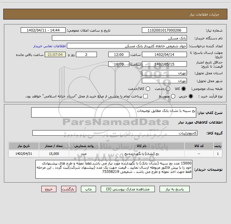 توضیحات خریدار:15000 عدد بج سینه (نشان بانک) با نگهدارنده مورد نیاز می باشد.لطفا نمونه و طرح های پیشنهادی خود را با پیش فاکتور مربوطه ارسال نمایید . قیمت جهت یک عدد (پیشنهاد شرکت)ثبت گردد . این مرحله فقط جهت اخذ نمونه و طرح می باشد . شفیعی 75358219