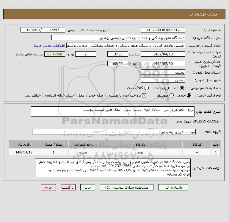 استعلام بها و موضوع استعلام استعلام برنج - تخم مرغ - پنیر - سالاد الویه - رشته سوپ - نمک طبق لیست پیوست به اطلاع کلیه شرکتها و افراد متخصص واجد شرایط میرساند، آگهی گذار در نظر دارد از طریق استعلام بها، نسبت به انتخاب و دریافت پیشنهادات اقدام نماید. این استعلام با کد آگهی ثبت شده در سامانه خبرگزاری پارس نماد : 6034105 منتشر شده است. مشخصات استعلام : تاریخ شروع استعلام: 1402/04/11 آخرین مهلت ارسال پیشنهاد قیمت : 1402/04/13 و محل اجرای پروژه : استان بوشهر میباشد. استعلام قیمت مورد درخواست : استعلام برنج - تخم مرغ - پنیر - سالاد الویه - رشته سوپ - نمک طبق لیست پیوست با دستهبندیهای تخصصی و گروه های مرتبط : مواد غذایی, نمک, دام و طیور, استعلام اطلاع رسانی میگردد.