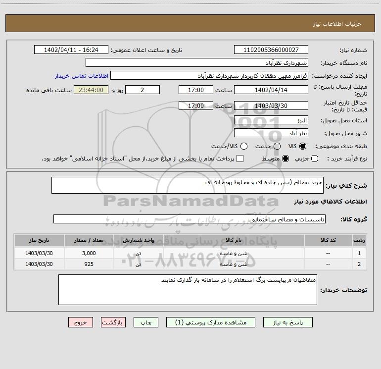 شرح کلی نیاز: خرید مصالح (بیس جاده ای و مخلوط رودخانه ای