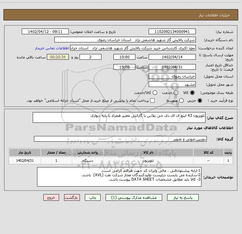 نام دستگاه خریدار:شرکت پالایش گاز شهید هاشمی نژاد استان خراسان رضوی