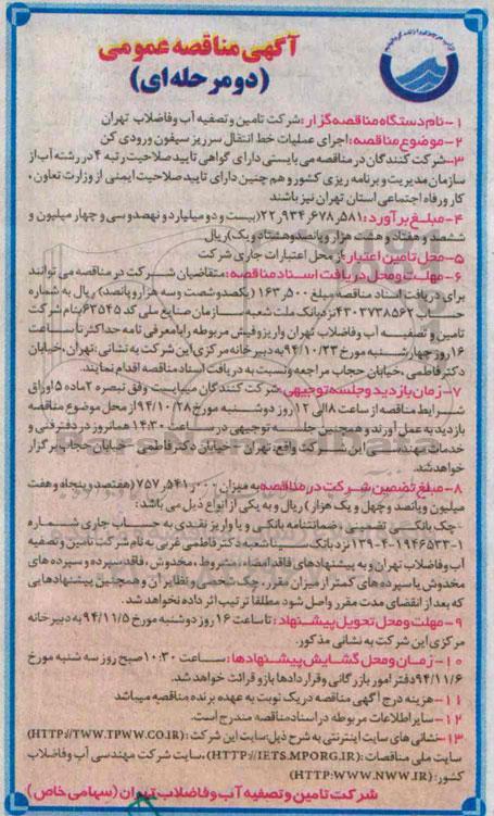 مناقصه اجرای عملیات خط انتقال سرریز سیفون ورودی کن, آگهی مناقصه عمومی دو مرحله ای,مناقصه اجرای عملیات خط انتقال سرریز سیفون ورودی کن