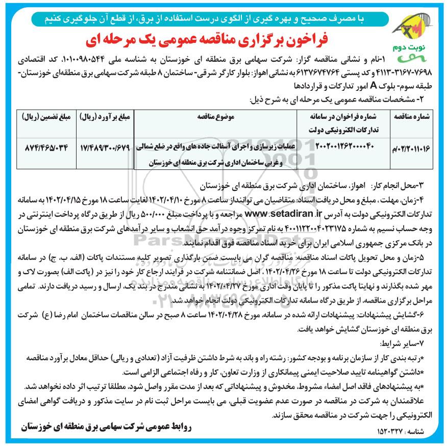| 2011016/02/م | 2002001262000040 | عملیات زیرسازی و اجرای آسفالت جادههای واقع در ضلع شمالی و غربی ساختمان اداری شرکت برق منطقهای خوزستان | 17.489.300.679 | 874.465.034 |