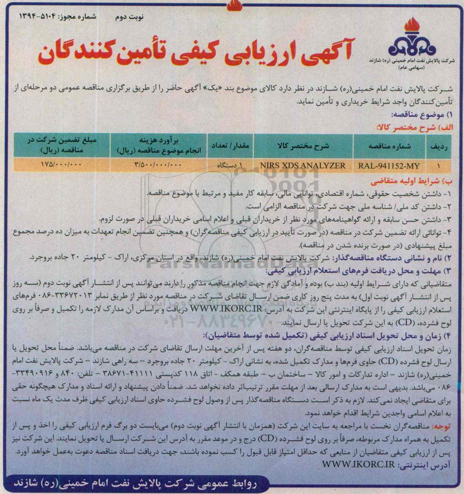ارزیابی کیفی NIRS XDS ANALYZER نوبت دوم از کلیه افراد متخصص و شرکتها واجد شرایط دعوت به عمل میآید در مناقصه با کد خبرگزاری پارس نماد: 603894 شرکت نمایند.