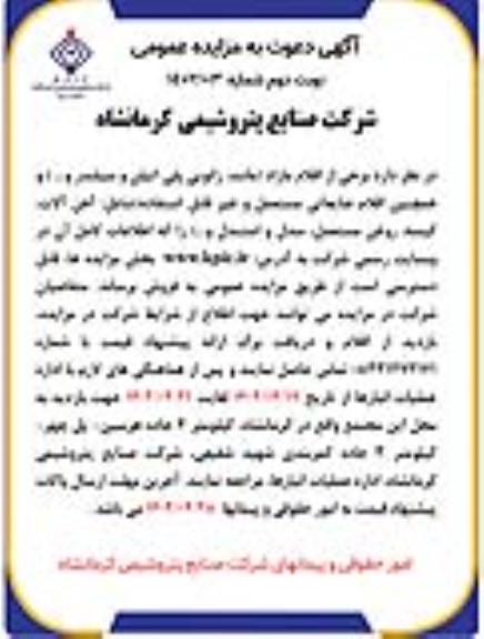 شرکت صنایع پتروشیمی کرمانشاه در نظر دارد برخی از اقلام مازاد ( مانند زانویی پلی اتیلن و سیلندر و ... )  و همچنین اقلام ضایعاتی مستعمل و غیر قابل استفاده ( شامل آهن آلات ، کیسه ، روغن مستعمل ، سدل و استندل و .... ) را که اطلاعات کامل ان در وبسایت رسمی شرکت به ادرس  www.kpic.ir بخش مزایده ها قابل دسترس است از طریق مزایده عمومی به فروش برساند