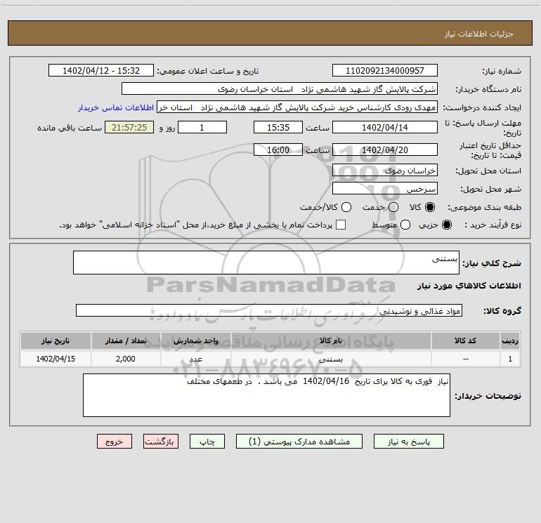 نام دستگاه خریدار:شرکت پالایش گاز شهید هاشمی نژاد استان خراسان رضوی