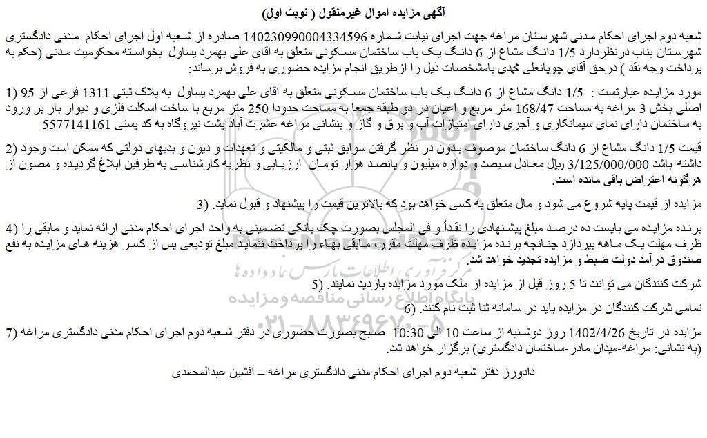 شعبه دوم اجرای احکام مدنی شهرستان مراغه جهت اجرای نیابت شماره 140230990004334596 صادره از شعبه اول اجرای احکام مدنی دادگستری شهرستان بناب درنظردارد 1/5 دانگ مشاع از 6 دانگ یک باب ساختمان مسکونی متعلق به آقای علی بهمرد یساول بخواسته محکومیت مدنی (حکم به پرداخت وجه نقد ) درحق آقای چوپانعلی محمدی بامشخصات ذیل را ازطریق انجام مزایده حضوری به فروش برساند:
