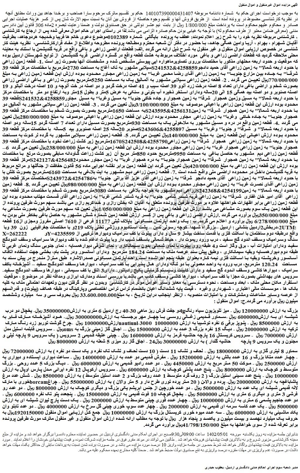 به موجب درخواست اجرای حکم به شماره دادنامه مربوطه 140107390000431407 حکم بر تقسیم ماترک مرحوم سارا صاحب و برخدا جاهد بین وراث مطابق آنچه در نظریه کارشناسی مضبوط در پرونده آمده است از طریق فروش آنها و تقسیم وجوه حاصله از فروش بین آنان به نسبت سهم الارث شان پس از کسر هزینه عملیات اجرایی صادر و محکوم علیهم محکوم است به پرداخت مبلغ 1/800/000 ریال از بابت نیم عشر دولتی در حق صندوق دولت و ضمنا رعایت تبصره 2ماده 306 قانون آیین دادرسی مدنی (معرفی ضامن معتبر از طرف محکوم له) با توجه به غیابی بودن حکم صادره الزامی می باشد.لذا در راستای اجرای حکم اموال معرفی شده پس از ارجاع به کارشناسی ، کارشناس مربوطه نظریه خود را به شرح زیر اعلام نمودند: عطف به پرونده بایگانی شماره 0102389موضوع دعوی خانم ها فریبا وخدیجه هردوجاهد، بطرفیت آقایان شهرام ، بهرام ، آریا وامین همگی جاهد، با حضور در دفتر آن شعبه محترم ومطالعه پرونده مطروحه واطلاع از مفاد قرارکارشناسی، نظریه هیئت کار شناسی در خصوص ارزیابی اموال منقول و غیر منقول به شرح ذیل ارائه می گردد .الف: قطعات اراضی زراعی و باغی واقع در قریه گندیشمن با استناد به معاینه محلی ملاحظه گردید که قطعات اراضی زراعی و باغی مورد اختلاف مربوط به هشت قطعه واقع در گستره اراضی قریه گندیشمن از توابع شهرستان اردبیل بوده که موقعیت و حدود اربعه محلهای مذکور با مختصات برروی تصاویرماهواره ایی پیوستی مشخص شده و مشخصات آنها بصورت زیر است .1- قطعه زمین زراعی سیلابی مشهور به تک آغاج به مساحت 2730مترمربع با مختصات مرکز قطعه 39S241532&4258859با حدود اربعه شمالا" به زمین زراعی آقای حمید دادجو شرقا" به جاده بین مزارع جنوبا" به زمین زراعی آقای رضا محبی غربا" به زمین زراعی مجاور محدود بوده ارزش این قطعه زمین زراعی به مبلغ 770/000/000ریال تعیین می گردد . 2- قطعه زمین زراعی سیلابی مشهور به آلمالیق یک به مساحت 5250مترمربع بصورت زراعی و باغی اراضی زراعی بصورت شخم و اراضی باغی دارای تعداد 8 اصله درخت زرد آلوو 39 اصله سیب و 41 اصله درخت گردو و دو اصله در خت آلوچه و 10 اصله درخت آلبالو و 19 اصله صنوبر و دو اصله بید همگی 15 الی 20ساله ودارای استخر ذخیره آب بتونی و سنکی به عرض 5متر و بطول 15متر وبه ارتفاع دو متر با مختصات مرکز قطعه 39S241532&4258859با حدود اربعه شمالا" به مسیل وزمین همجوار شرقا" به زمین همجوار و جاده خاکی جنوبا" به مسیل وغربا" به مسیل مجاور محدود بوده ارزش این قطعه زمین زراعی با اعیانی موصوف به مبلغ 3/100/000/000ریال تعیین می گردد . 3- قطعه زمین زراعی سیلابی مشهور به آلمالیق دو به مساحت 1650مترمربع بصورت بصورت شخم با مختصات مرکز قطعه 39S243595&4256131با حدود اربعه شمالا" به زمین همجوار شرقا" به زمین همجوار جنوبا" به جاده خاکی وغربا" به زمین زراعی مجاور محدود بوده ارزش این قطعه زمین زراعی با اعیانی موصوف به مبلغ 280/000/000ریال تعیین می گردد .4- قطعه زمین واقع در دره و مسیل مشهور به ملاهولی یک به مساحت 930مترمربع بصورت مسیل دارای تعداد 7 اصله گردو 15ساله ودو اصله صنوبر 20ساله 25 اصله صنوبرو بید 5ساله با مختصات مرکز قطعه 39S243606&4255897با حدود اربعه شمالا" و شرقا" و جنوبا" وغربا" به مسیل محدود بوده ارزش اعیانی این قطعه زمین به مبلغ 140/000/000ریال تعیین می گردد. 5- قطعه زمین زراعی سیلابی مشهور به گرده لر کوت به مساحت 1670مترمربع زیر کشت زراعت نخود با مختصات مرکز قطعه 39S242508&4255790با حدود اربعه شمالا" به زمین زراعی همجوار شرقا" به زمین زراعی همجوار جنوبا" به زمین زراعی همجوار غربا" به زمین زراعی مجاور محدود بوده ارزش این قطعه زمین زراعی به مبلغ 238/000/000ریال تعیین می گردد 6-- قطعه زمین زراعی دیم مشهور به حاصل باغی به مساحت 9950مترمربع حدود 850متر مربع آن زیر کشت زراعت گاودانه مابقی بصورت مرتع با مختصات مرکز قطعه 39S242127&4256482با حدود اربعه شمالا" به زمین همجوار شرقا" به زمین همجوار جنوبا" به دره همجوار غربا" به زمین مجاور محدود بوده ارزش این قطعه زمین زراعی به مبلغ 420/000/000ریال تعیین می گردد این قطعه زمین 