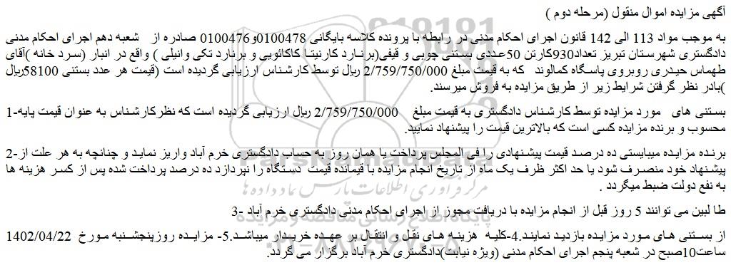 به موجب مواد 113 الی 142 قانون اجرای احکام مدنی در رابطه با پرونده کلاسه بایگانی 0100478و0100476 صادره از شعبه دهم اجرای احکام مدنی دادگستری شهرستان تبریز تعداد930کارتن 50عددی بستنی چوبی و قیفی(برنارد کارنیتا کاکائویی و برنارد تکی وانیلی ) واقع در انبار (سرد خانه )آقای طهماس حیدری روبروی پاسگاه کمالوند که به قیمت مبلغ 2/759/750/000 ریال توسط کارشناس ارزیابی گردیده است (قیمت هر عدد بستنی 58100ریال )بادر نظر گرفتن شرایط زیر از طریق مزایده به فروش میرسند.