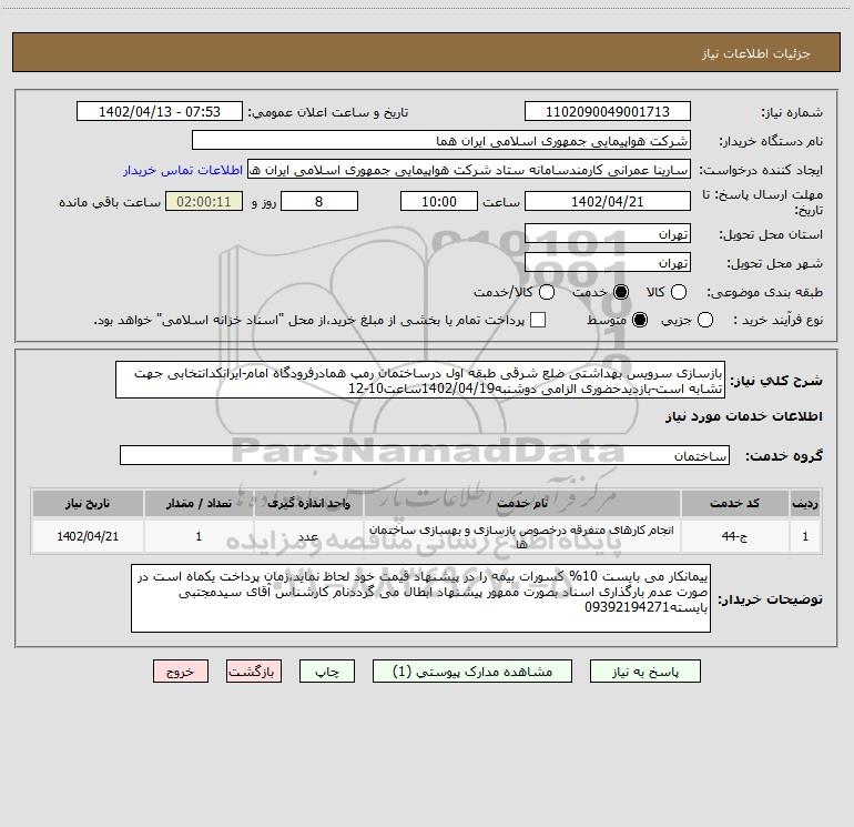 شرح کلی نیاز: بازسازی سرویس بهداشتی ضلع شرقی طبقه اول درساختمان رمپ همادرفرودگاه امام-ایرانکدانتخابی جهت تشابه است-بازدیدحضوری الزامی دوشنبه1402/04/19ساعت10-12