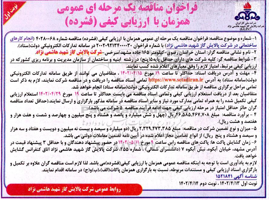 شماره موضوع مناقصه: فراخوان مناقصه یک مرحله ای عمومی همزمان با ارزیابی کیفی فشرده مناقصه شماره 40280068 (انجام کارهای ساختمانی در شرکت پالایش گاز شهید هاشمی نژاد) با شماره فراخوان 2002092134000030 در سامانه تدارکات الکترونیکی دولت ستاد