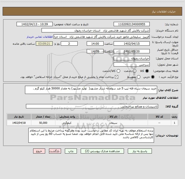 استعلام خرید سیمان سیاه فله تیپ 5 ضد سولفاته شرق مشهد( تولید مشهد) به مقدار 50000 هزار کیلو گرم ., استعلام خرید سیمان سیاه فله تیپ 5 ضد سولفاته شرق مشهد( تولید مشهد) به مقدار 50000 هزار کیلو گرم .