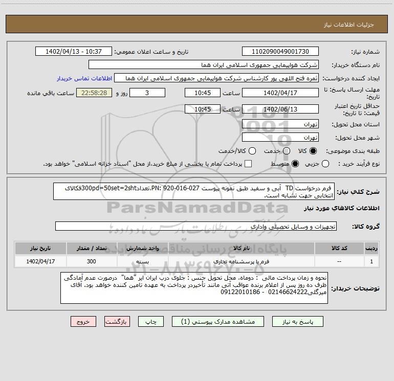 شرح کلی نیاز: فرم درخواست TD آبی و سفید طبق نمونه پیوست PN: 920-016-027،تعداد300pd=50set=2shtفکالای انتخابی جهت تشابه است.