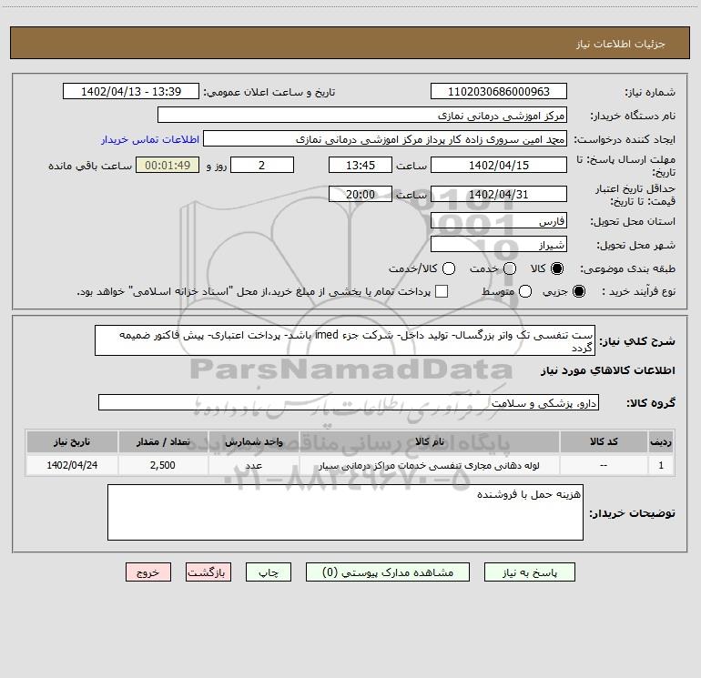 شرح کلی نیاز: ست تنفسی تک واتر بزرگسال- تولید داخل- شرکت جزء imed باشد- پرداخت اعتباری- پیش فاکتور ضمیمه گردد