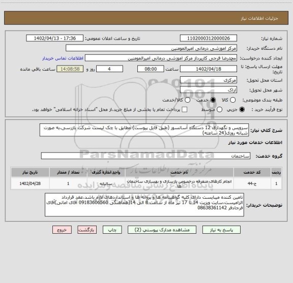 شرح کلی نیاز: سرویس و نگهداری 12 دستگاه آسانسور (طبق فایل پیوست) مطابق با چک لیست شرکت بازرسی،به صورت شبانه روزی(24 ساعته)