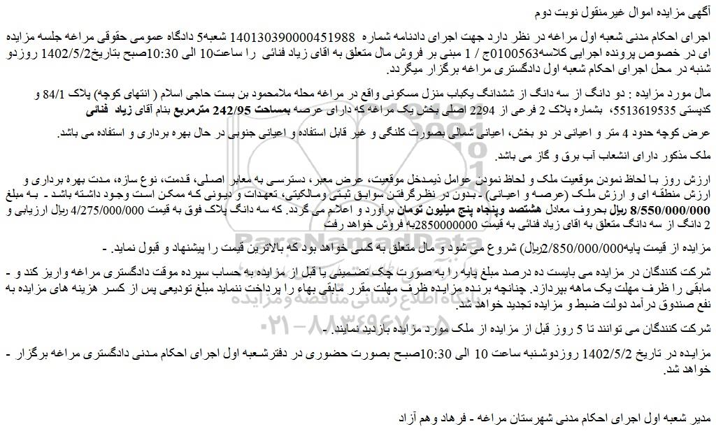 مزایده فروش دو دانگ از سه دانگ از ششدانگ یکباب منزل مسکونی , مزایده فروش دو دانگ از سه دانگ از ششدانگ یکباب منزل مسکونی