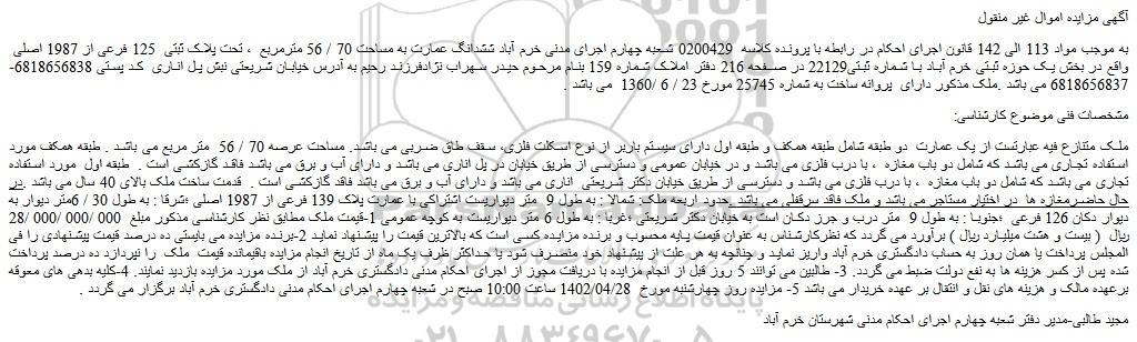 به موجب مواد 113 الی 142 قانون اجرای احکام در رابطه با پرونده کلاسه 0200429 شعبه چهارم اجرای مدنی خرم آباد ششدانگ عمارت به مساحت 70 / 56 مترمربع ، تحت پلاک ثبتی 125 فرعی از 1987 اصلی واقع در بخش یک حوزه ثبتی خرم آباد با شماره ثبتی22129 در صفحه 216 دفتر املاک شماره 159 بنام مرحوم حیدر سهراب نژادفرزند رحیم به آدرس خیابان شریعتی نبش پل اناری کد پستی 6818656838-6818656837 می باشد .ملک مذکور دارای پروانه ساخت به شماره 25745 مورخ 23 / 6 /1360 می باشد .