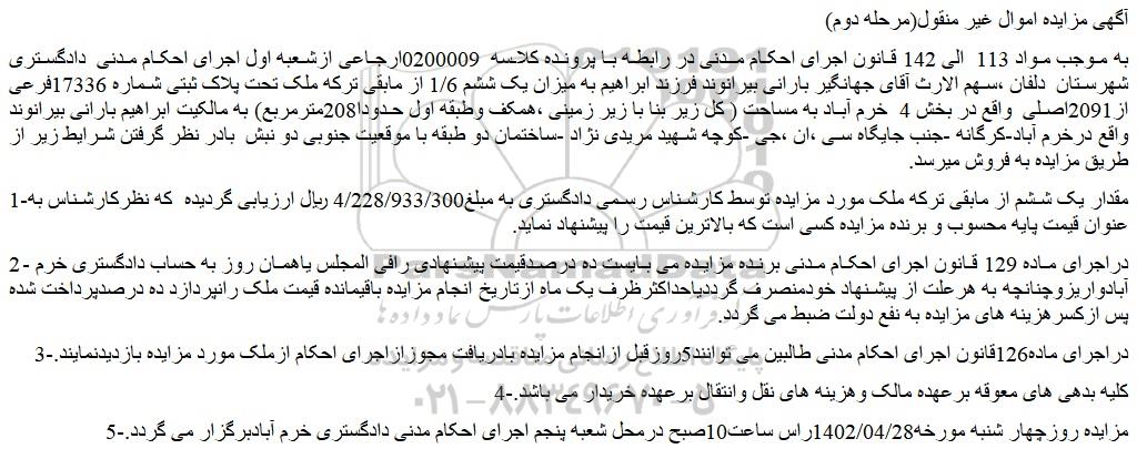 به موجب مواد 113 الی 142 قانون اجرای احکام مدنی در رابطه با پرونده کلاسه 0200009ارجاعی ازشعبه اول اجرای احکام مدنی دادگستری شهرستان دلفان ،سهم الارث آقای جهانگیر بارانی بیرانوند فرزند ابراهیم به میزان یک ششم 1/6 از مابقی ترکه ملک تحت پلاک ثبتی شماره 17336فرعی از2091اصلی واقع در بخش 4 خرم آباد به مساحت ( کل زیر بنا با زیر زمینی ،همکف وطبقه اول حدودا208مترمربع) به مالکیت ابراهیم بارانی بیرانوند واقع درخرم آباد-کرگانه -جنب جایگاه سی ،ان ،جی -کوچه شهید مریدی نژاد -ساختمان دو طبقه با موقعیت جنوبی دو نبش بادر نظر گرفتن شرایط زیر از طریق مزایده به فروش میرسد.