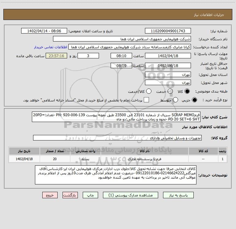 شرح کلی نیاز: فرمSCRAP MEMO سریال از شماره 23101 الی 23500 طبق نمونه پیوست PN: 920-006-139 -تعداد:20PD= PD 20 SET=6 SHT -نحوه و زمان پرداخت مالی:دو ماه