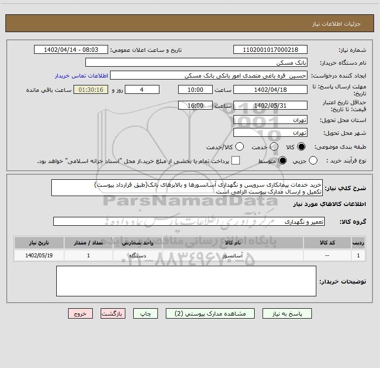 شرح کلی نیاز: خرید خدمات پیمانکاری سرویس و نگهداری آسانسورها و بالابرهای بانک(طبق قرارداد پیوست)