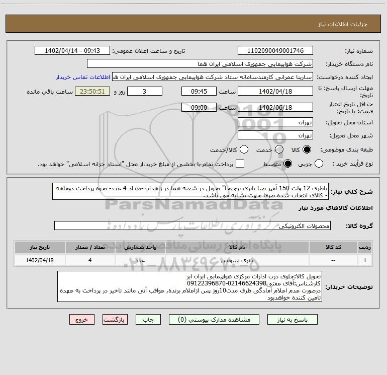 شرح کلی نیاز: باطری 12 ولت 150 آمپر صبا باتری ترجیحا" تحویل در شعبه هما در زاهدان -تعداد 4 عدد- نحوه پرداخت دوماهه - کالای انتخاب شده صرفا جهت تشابه می باشد.