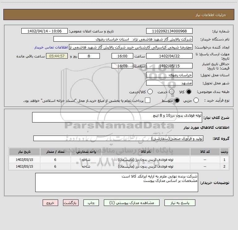 شرح کلی نیاز: لوله فولادی بدون درز10 و 8 اینچ