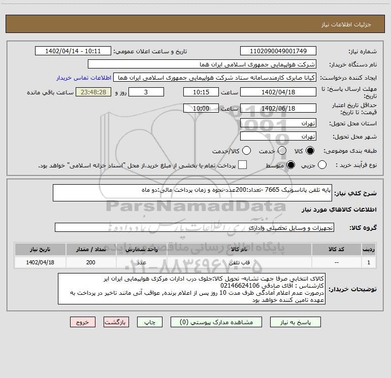 شرح کلی نیاز: پایه تلفن پاناسونیک 7665 -تعداد:200عدد-نحوه و زمان پرداخت مالی:دو ماه